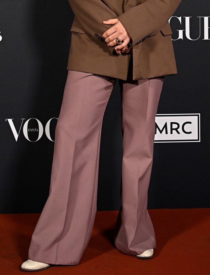 Que el cantante apostase por un color berenjena en sus pantalones dice mucho de él, ya que es un tono muy complicado de combinar... pero como vemos, para él no ha sido complicado. Arriesgó y ganó. Una pieza que presenta pernera acampanada con raya que crea un efecto óptico mucho más formal.