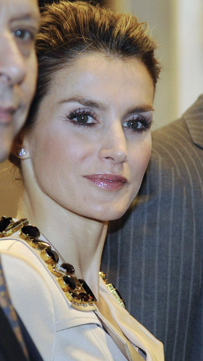 En cuanto al maquillaje, doña Letizia ha escogido una base muy natural, destacando sus ojos con el rimmel, que alarga sus pestañas. En los labios, un suave gloss en tono rosa palo, en consonancia con el resto del rostro.