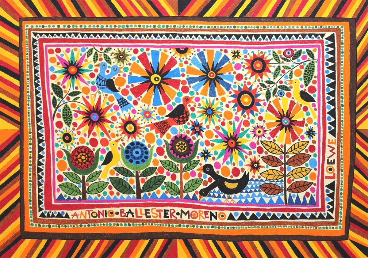 Los cuadros de Ballester Moreno, optimistas, enérgicos, de estilo naif, en los que abundan las evocaciones de la infancia, se distinguen por sus colores atrevidos y cálidos a la vez. Los pájaros y las flores, tan presentes en los mantones, son dos motivos recurrentes en su obra que ha trasladado a esta colección.