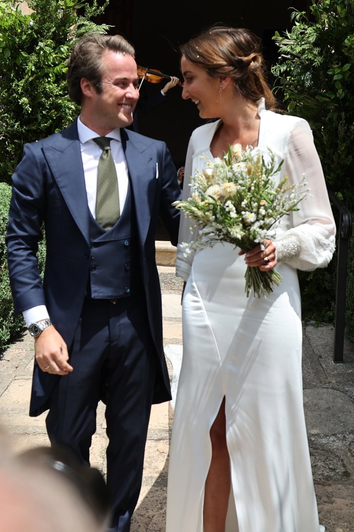 La novia ha confiado en Inés Nuñez para este gran día y ha lucido un vestido minimalista, escote en 'V', cuello chimenea, de corte imperio y una falda acampanada con una abertura frontal que le daba un toque sofisticado. En la parte de arriba, de lo más impresionante, lucía mangas largas y una apertura en la espalda que ha sido de lo más comentado.