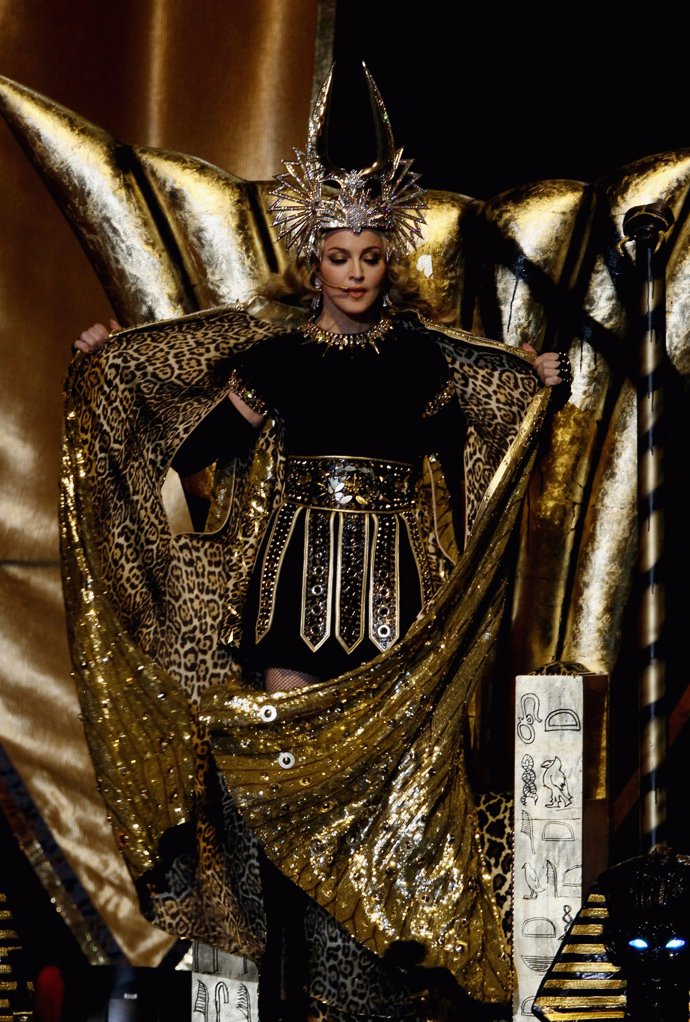 Por otro lado, un año antes, tenemos a la veterana Madonna, la cual no dudó en calzarse un traje al más puro estilo de diosa egipcia. Con una corona, también de negro mezclando el dorado, sin duda un traje muy adecuado con los sorprendentes looks que se calza la ambición rubia en cualquiera de sus shows.