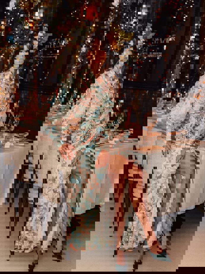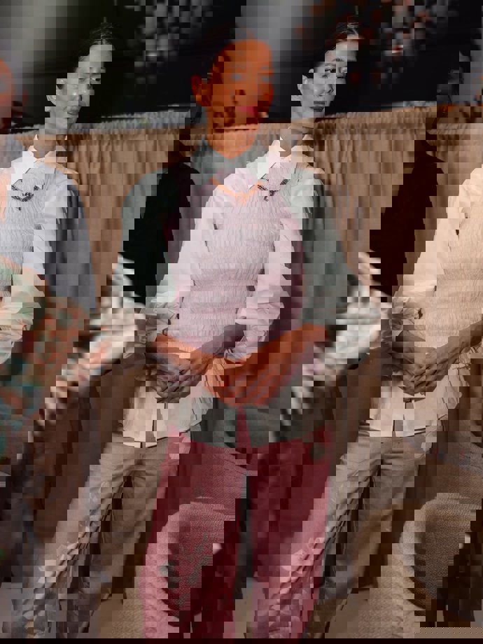La falda se presenta en tonos pastel, de largo midi con diseño envolvente y juego de drapeados en la cintura que estilizan la silueta. Lo que más nos fascina de este diseño es el bajo asimétrico con volantes, que aporta movimiento e ligereza, creando una caída fluida y elegante. En cuanto a la blusa es corta con cuello camisero y abotonadura frontal, mangas abullonadas con terminaciones en puño y cinturilla del mismo tejido con lazo para ajustar y definir la estructura.