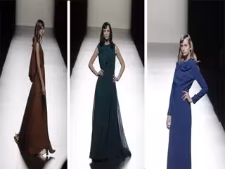 Vestidos en tonos suaves, rosas palo, camel y naranjas, en contrapunto con los azules eléctrico marcados con brillo y el verde botella. Destacan los cortes por debajo de la rodilla. Los midi se combinan con los largos que terminan en largas colas.