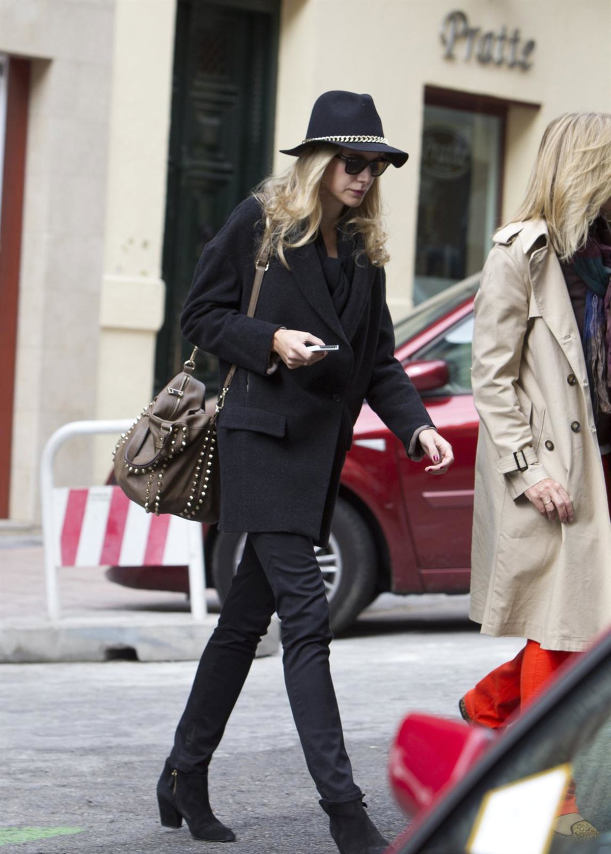 Lo rockero de su look lo aportaban sus complementos: un sombrero de ala un poco ancha con una cadena dorada en lugar de la clásica cinta de los borsalinos y un bolso grande con tachuelas marrón, que rompía el total look en negro.