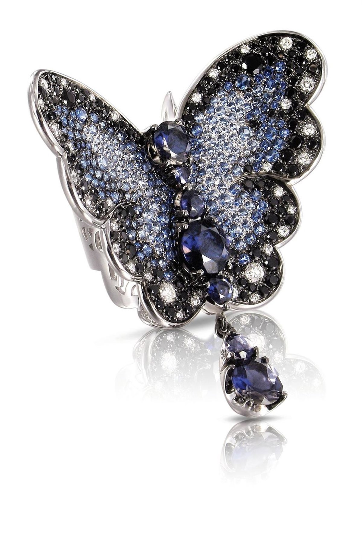 Brillantes mariposas de oro blanco levantan el vuelo desde el prado encantado de Pasquale Bruni, algunas seduciendo con alas de diamantes blancos, mientras otras más grandes y majestuosas cautivan la mirada con el azul profundo de los zafiros, suavizado por el negro de las espinelas e iluminado por el blanco de los diamantes.