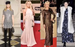 Margot Robbie eligió un diseño de Miu Miu en tono nude adornado con plumas y pequeños brillantes que daban un toque más elegante al estilismo. Una pequeña cola y un escote halter, ponían el broche de oro al vestido que acompañó con complementos en tonos plata metalizado.