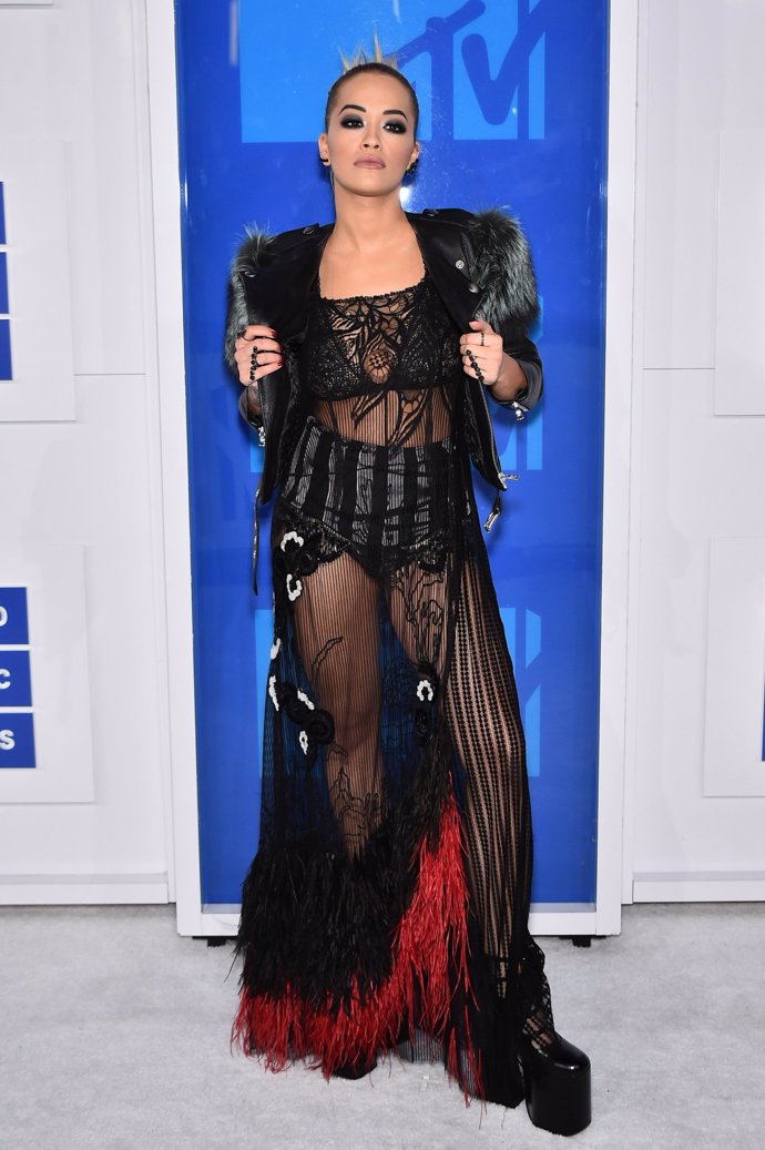 Las transparencias también estuvieron presentes en el outfit de Rita Ora que combinó un vestido de Marc Jacobs de plumas y encaje con una perfecto con pelo.