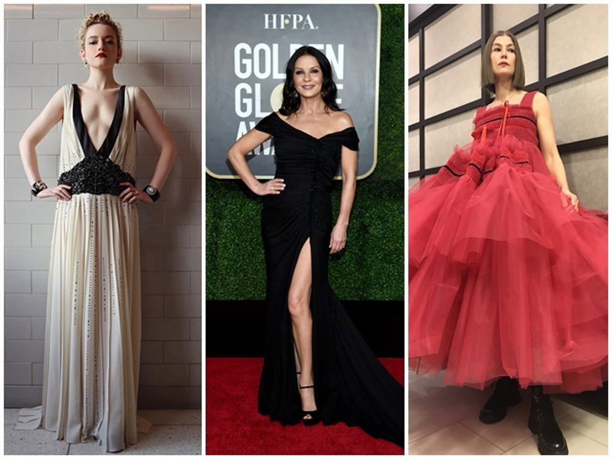 Rosamund Pike. La actriz, ganadora del Premio a Mejor Actriz de Comedia por "Descuida, yo te cuido", ha hecho gala de su originalidad con un vestido rojo de tul de Molly Goddard con diferentes volúmenes y lazos rojos en el frontal. Como complementos, unas botas negras de estilo militar. Cuanto menos, peculiar y diferente.