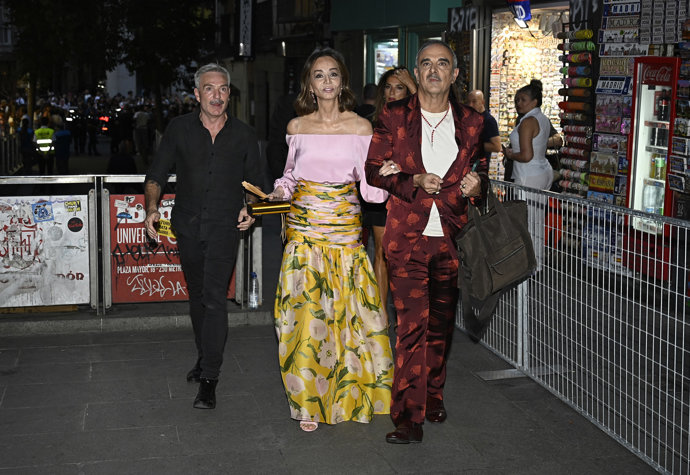 Isabel Preysler. Confirmando por qué está considerada una de las mujeres más elegantes de nuestro país, la madre de Tamara Falcó cautivó con un dos piezas de seda compuesto por top rosa pálido con escote bardot y manga larga, y falda larga amarilla con estampado de orquídeas en el mismo rosa que la parte de arriba.