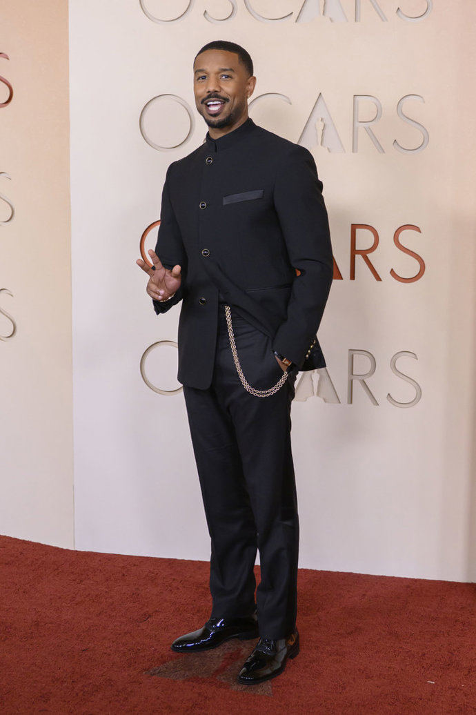 Elegante y contemporáneo, propio de una noche de gala como la de los Oscar, Michael ha apostado por un traje completamente negro de corte impecable que destaca por su silueta limpia y estructurada. La chaqueta presenta un diseño minimalista con cuello tipo mandarina, lo que aporta un aire sofisticado y moderno al conjunto, alejándose del clásico esmoquin con solapas tradicionales.