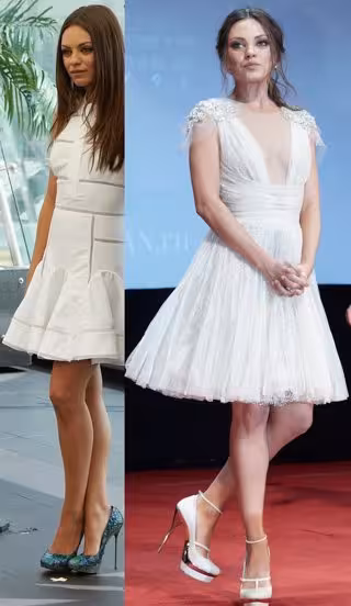 Al día siguiente, Kunis seguía inmersa en esa profundidad angelical de paz y pureza y, por eso, volvió a elegir un estilo parecido para acudir al photocall. Esta vez combinó el vestido, más tipo cocktail y apto para día y tarde más que para la noche, con unos zapatos de tacón de aguja en azul turquesa y estampado de serpiente.