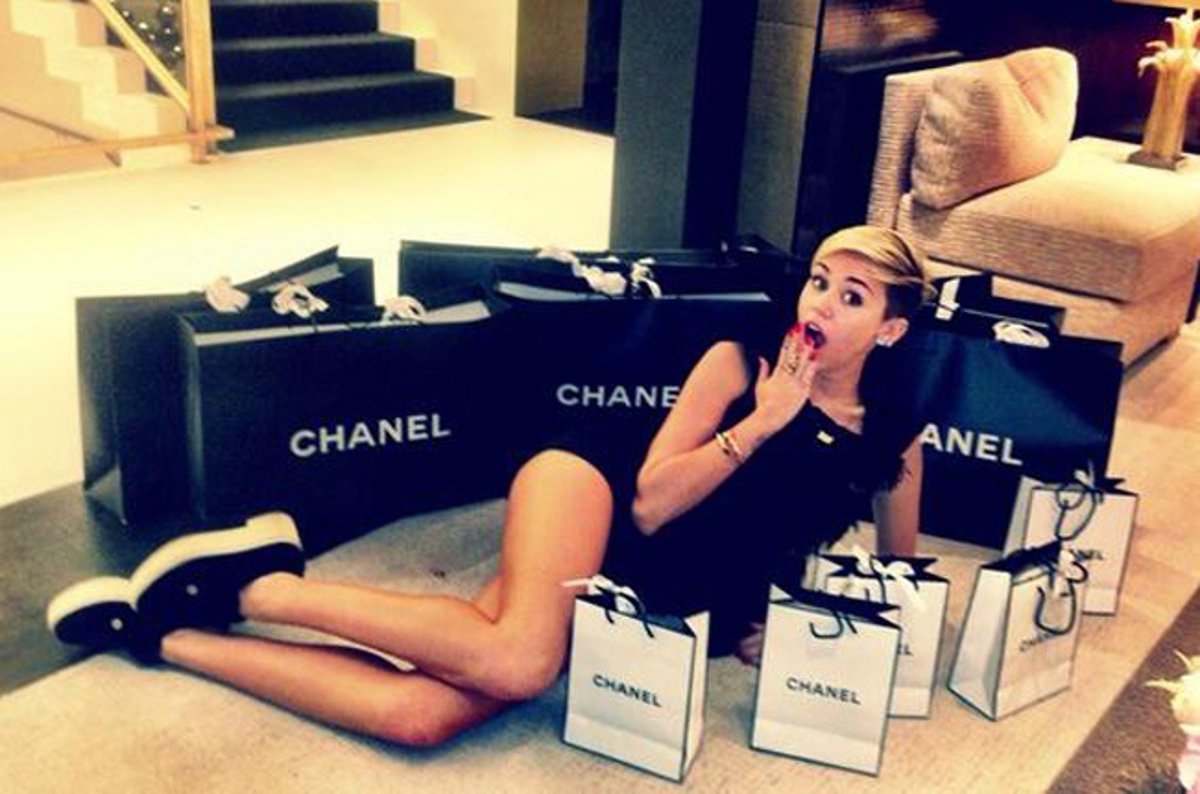 La actriz y cantante de 20 años salió de la exclusiva tienda cargada de bolsas, aunque no fue ella quien las llevó al coche sino que hicieron falta dos personas para llevar el montón de bolsas que Miley había adquirido. Más tarde twitteó una fotografía rodeada de todas sus compras donde decía "el daño está hecho".