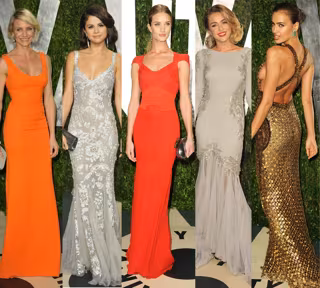 Salma Hayek se desvió más hacia el tono frambuesa en un romántico vestido ceñido a la cintura que combinó con una trenza ladeada y Cameron Diaz consiguió arreglar su fracaso de la alfombra roja de los Oscar con este sencillo a la par que maravilloso diseño slim de Victoria Beckham en naranja intenso.
