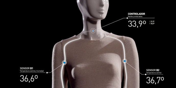 El resultadode esta investigación ha sido una prenda que tiene incorporada una serie de sensores repartidos en cuatro puntos que medirán la temperatura corporal. Los sensores están distribuidos entre las mangas, donde dos sensores recogen la temperatura periférica, y otros dos, en la axila, recogen la temperatura central del cuerpo. Además, uno de ellos medirá la humedad, parámetro determinante para conocer la sensación térmica. Mediante un controlador central, se recogen todos los datos y se sincronizan para enviarlos al Cloud.