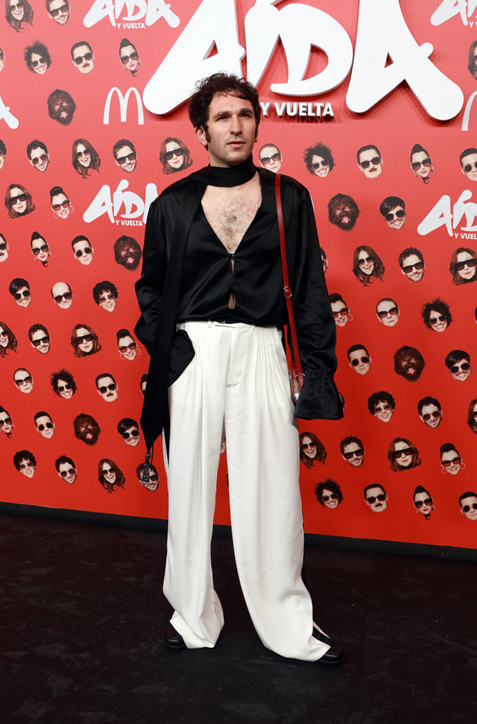 Su atuendo fue arriesgado, sí... pero no para tanto. Moderno, cómodo y fluido, el actor lució blusa satinada en color negro con lazada en el cuello, escote XXL en pico, mangas anchas y puños campana con pantalón blanco con caída y aberturas laterales en los bajos. ¿Cómo complemento? Bolso minimalista en color rojo.