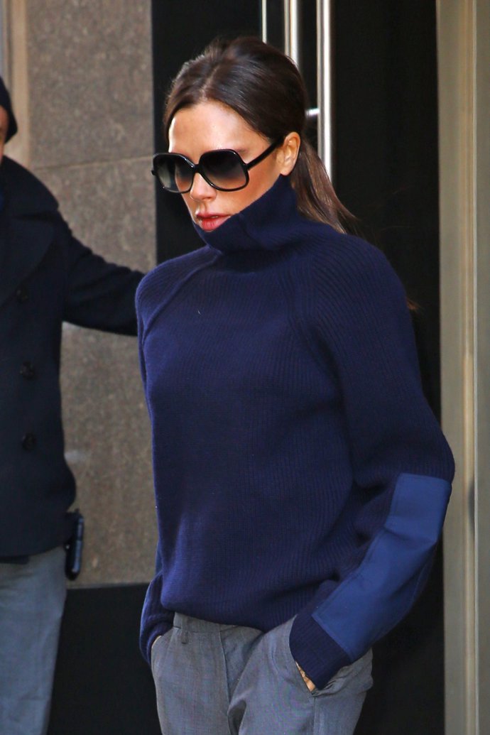 Victoria ha puesto de moda las faldas lápiz con botas hasta la rodilla, los tacones infinitos en todas las ocasiones, las enormes gafas de sol, su manera de posar de lado con mirada altiva y su característica manera de llevar el bolso colgado de antebrazo. Todas esas tendencias están presentes en los diseños de su firma y parece que la dieñadora tiene una nueva obsesión fashion que nos quiere meter por los ojos: los jerséis de cuello alto.