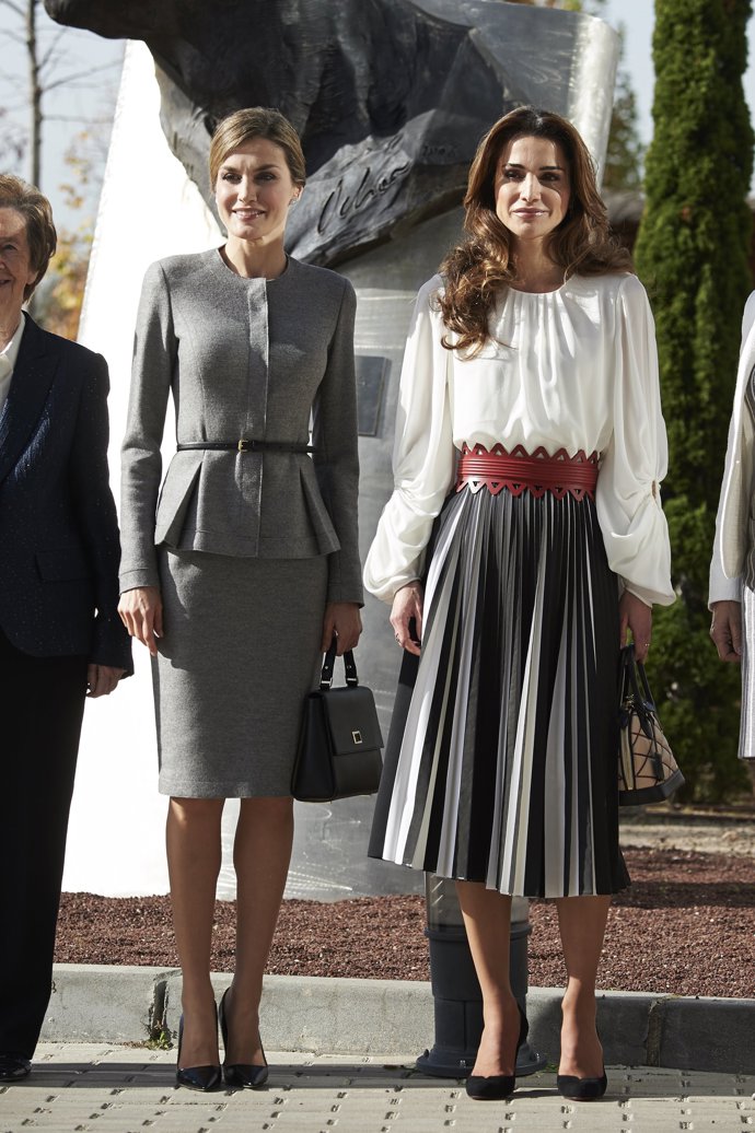 Una de las reinas más estilosas, Rania de Jordania, estaba impecable con una falda midi de tablas en blanco y negro durante su visita a España y su particular duelo de estilo con a reina Leitizia.