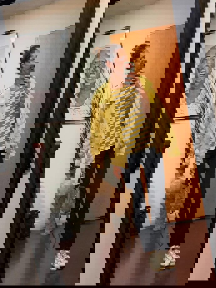 Camiseta, pantalón y chaqueta. Nada más. Un estilismo relajado, pero con matices interesantes que elevan el conjunto. Por un lado, la camiseta con cuello redondo presenta estampado a rayas blancas y amarillas; el pantalón, azul marino, es un básico de cualquier armario y la chaqueta... la chaqueta nos ha enamorado porque es tipo bomber, con manga abullonada, terminaciones en puño y maxisolapas. Como si de una parka corta se tratase.