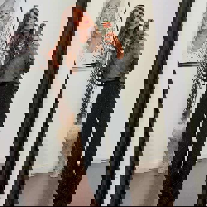 Acostumbrados a sus apuestas por colores llamativos o complementos extravagantes que elevan el outfit que luzca, en esta ocasión Roca apostó por tonos oscuros con un look formado por vaqueros de Mango con lentejuelas, jersey gris de Mysulafish y, la pieza fundamental: una cinta de lentejuelas -que ella misma llama fular en el perfil de sus redes sociales- que eleva su estilismo.