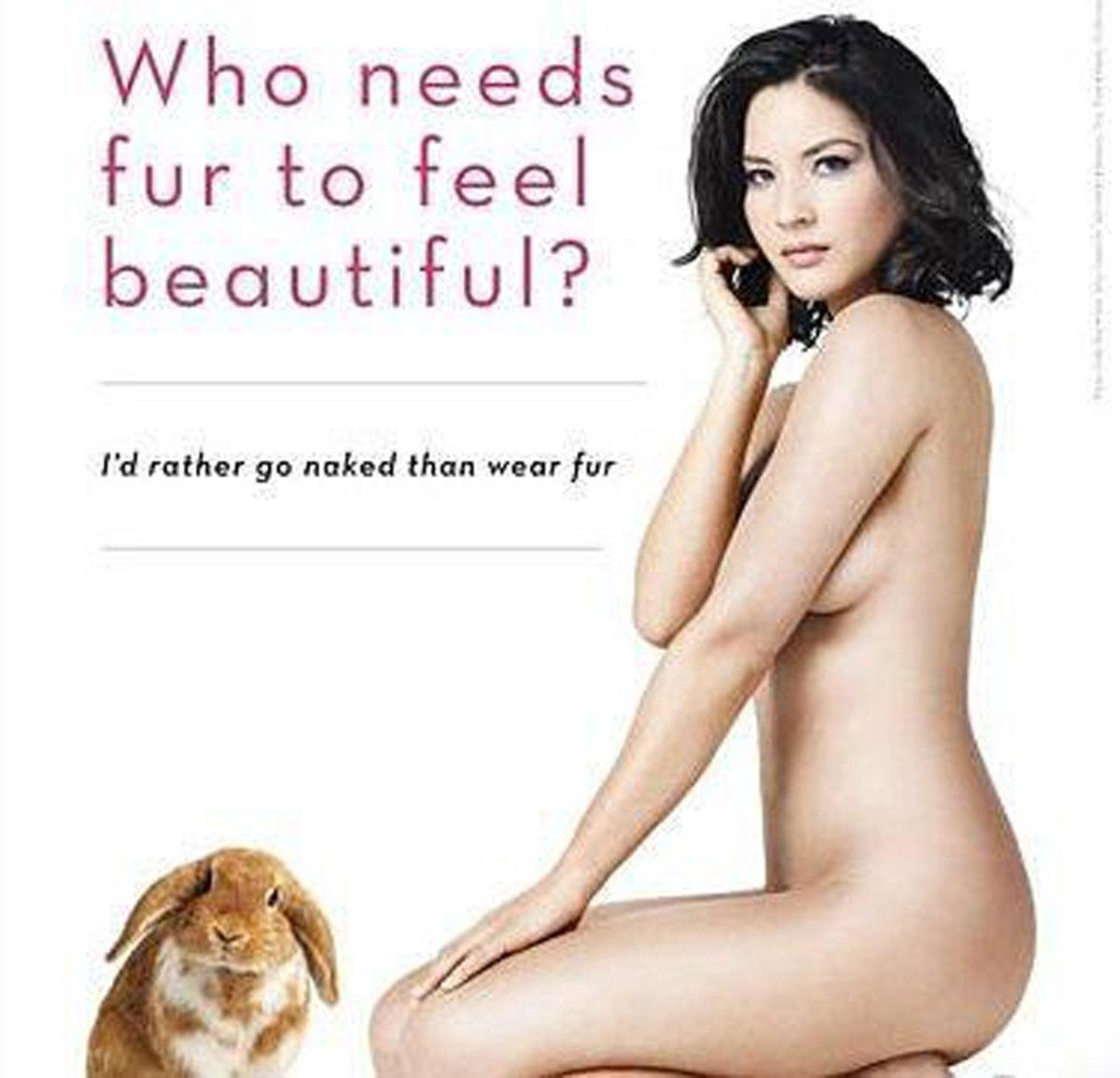 Bajo el lema: ¿Quién necesita piel para sentirse guapa? Prefiero ir desnuda antes que lucir pieles, Olivia Munn es la última en quitarse la ropa para unirse al movimiento contra la peletería de PETA, People for the Ethical Treatment of Animals, es decir, personas que luchan por el tratamiento ético de los animales.
