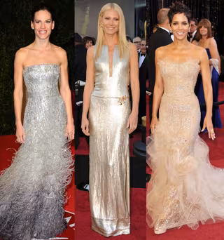 Anne Hathaway y Jennifer Lawrence completaron el listado de las mejor vestidas en esta tonalidad. La primera esocogió un traje de Valentino Couture 2002, palabra de honor, con falda de tubo y recto y sencillo por delante, puesto que todo el protagonismo recaía por la parte de atrás, con cola abullonada y flores en los laterales; mientras que la rubia actriz hizo una sexy aparición con un escotado vestido de Calvin Klein y clutch plateado de Judith Leiber.