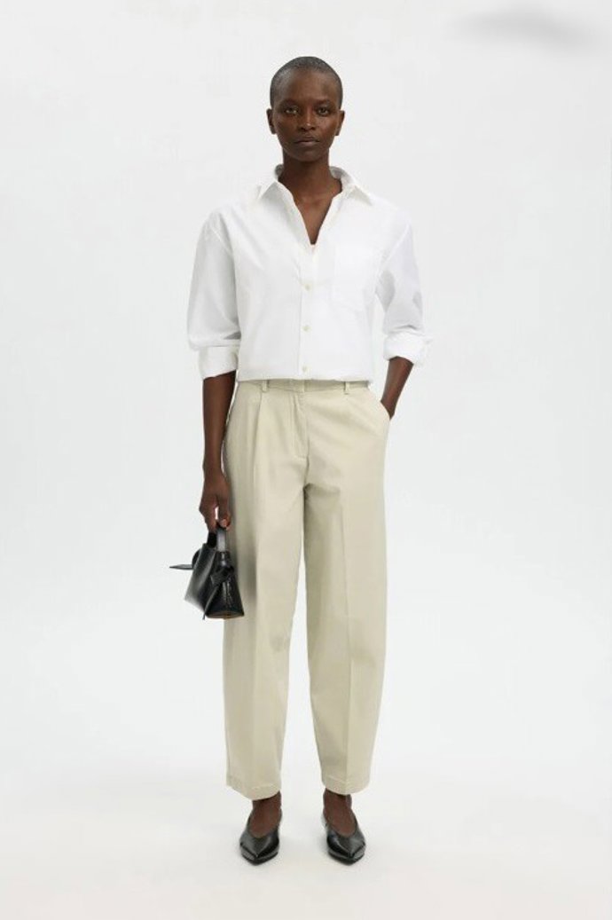 Cortefiel ofrece un pantalón muy versátil, tanto para ir a la oficina como para disfrutar de una cena acompañada de amigas. De sarga con pinzas tipo barrel, cintura alta, con bolsillos laterales y traseros falsos, este diseño es perfecto gracias a su largo tobillero que te permitirá jugar con el calzado.