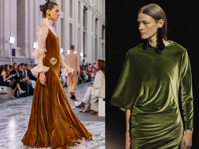 Y si hablamos de lo que realmente cambia el cómo vestimos —no solo el qué—, hay un protagonista claro: el tercipelo. Frente al cuero de siempre, más rígido y evidente, aparece este material más suave, más cálido y sin duda, más elegante. En desfiles como los de Pedro del Hierro, Claro Couture o Erroz, el terciopelo aporta una sensación distinta: prendas que apetecen llevar, y que conectan con una idea de lujo más cercana.