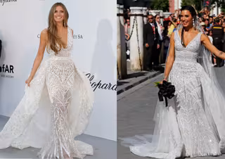 El vestido de novia de Pilar Rubio es practicamente igual al que lució el año pasado Heidi Klum en la gala amfAR, a excepción de la capa de la cintura que salen de forma distinta y que el vestido de la mujer del jugador de fútbol es más tupido y con un poco más de aire abajo para poder andar mejor.
