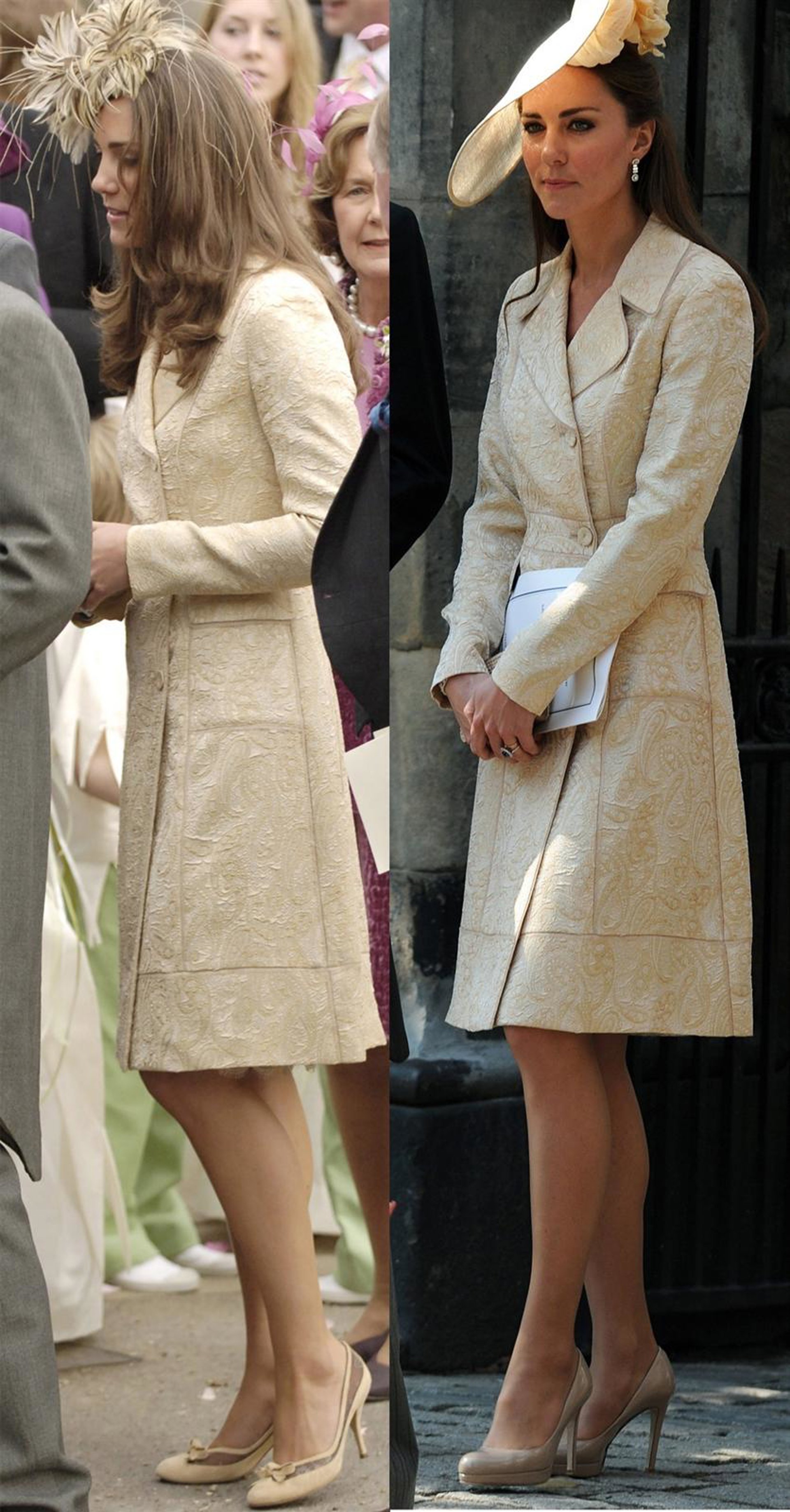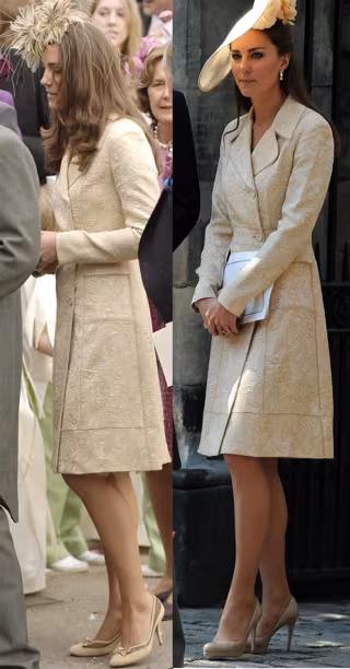 Después, para el enlace matrimonial del sábado, la Princesa Catalina eligió un abrigo con bordados de seda en color crema, que también nos sonaba de antes. Concretamente, lo lució en la boda de Laura Parker Bowles de 2006.