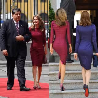 El viaje oficial de los Príncipes de Asturias a Perú ha servido para que Doña Letizia recupere de su armario algunos de los trajes con los que más elogios ha cosechado en los últimos meses. Con el vestido de pliegues en color berenjena que lució en la visita de Carla Bruni a España, así como el maravilloso vestido rojo drapeado que se enfundó en la cena previa al enlace de Victoria de Suecia, Letizia volvió a causar sensación reutilizando algunos de sus modelos estrella en esta época de crisis.