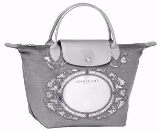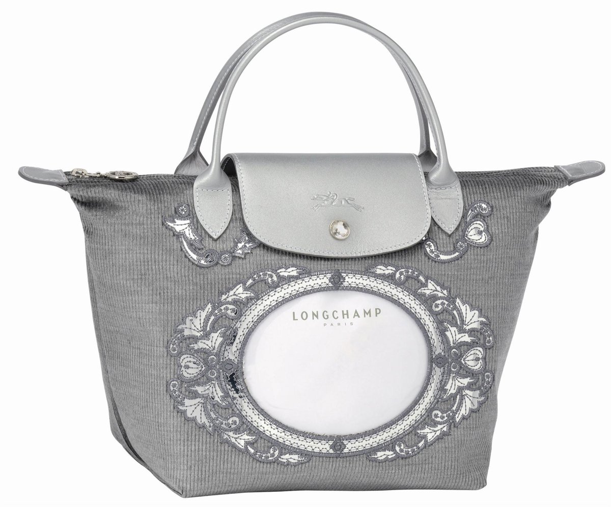 Adelante con Venecia y sus famosos espejos de vidrio decorado, que interpreta Le Pliage con sus extravagantes bordados, recreando el efecto espejo alrededor de un cuadro central, que podemos personalizar con la imagen que queramos. El bolso de pana gris-plata y las piezas de cuero metalizado completan perfectamente el diseño, el toque final lo aporta un botón de cristal brillante.