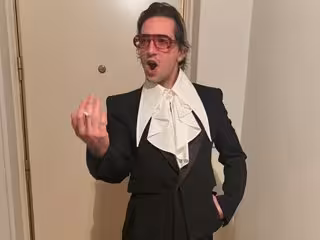 A causa de su puesta en escena, el artista destacó por llevar un look compuesto por un traje negro y una blusa blanca extravagante.