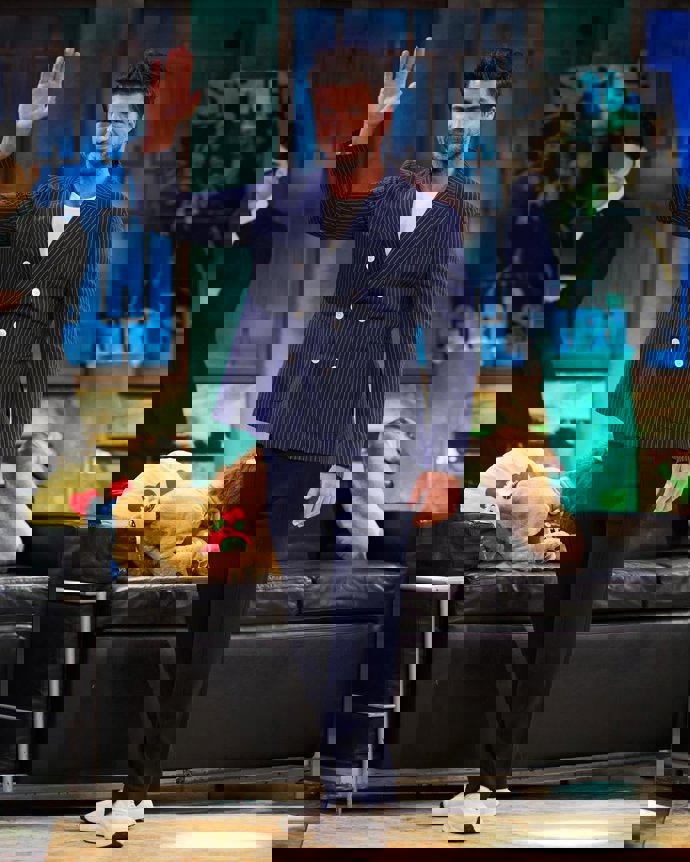 La percha de su entrevista en el programa de David Broncano se debe a que está promocionando la segunda temporada de su serie, 'Punto Nemo' y su estilismo es toda una declaración de intenciones. En primer lugar porque se trata de la primera aparición pública del actor tras salir a la luz su 'romance' con Aitana Sánchez-Gijón y, en segundo lugar, porque lo tenía todo pensado.