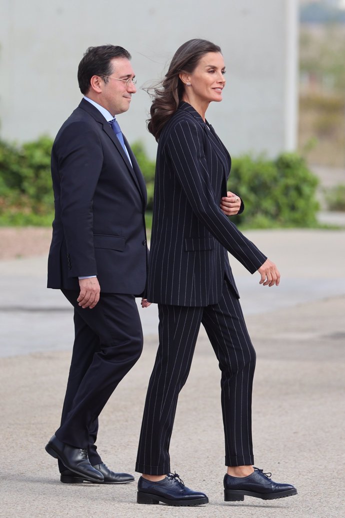 Para esta ocasión, la Reina Letizia se ha dejado ver con un traje sastre, de raya diplomática, con zapato plano con maxisuela y un top blanco. Los monarcas han sido despedido en el pabellón de Estado, de la Terminal T-4, con honores justo antes de emprender este viaje de estado de tres días.