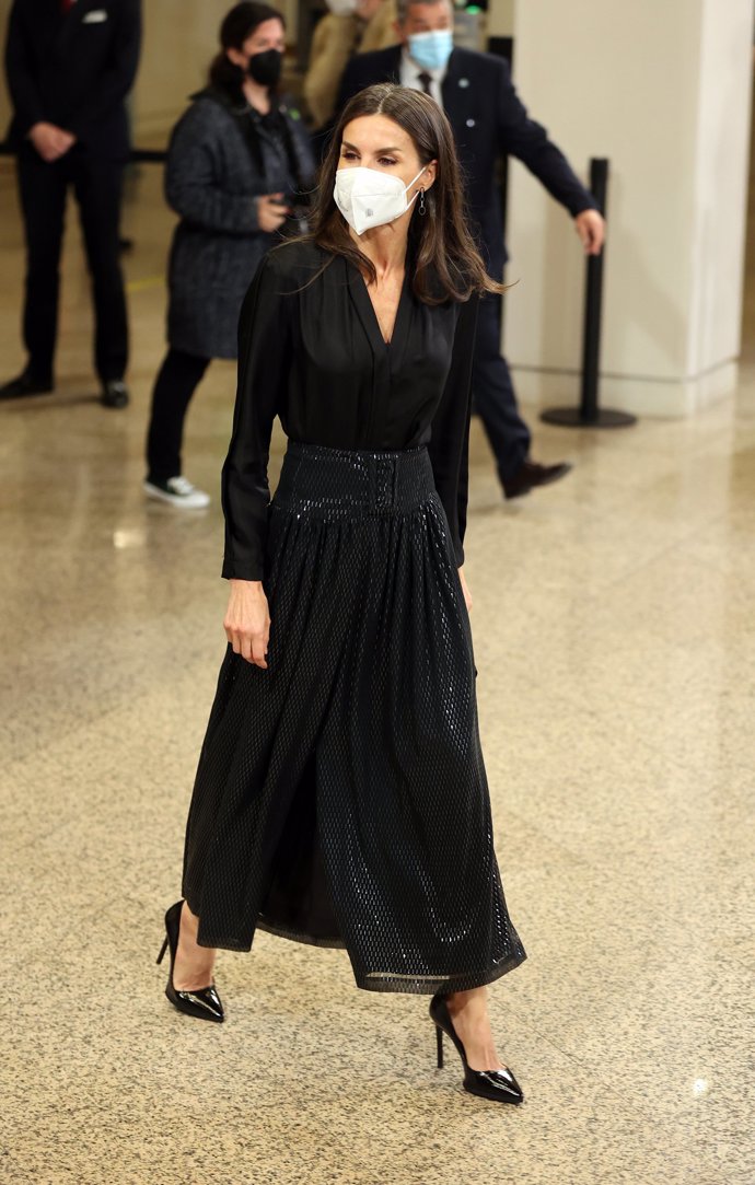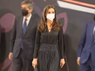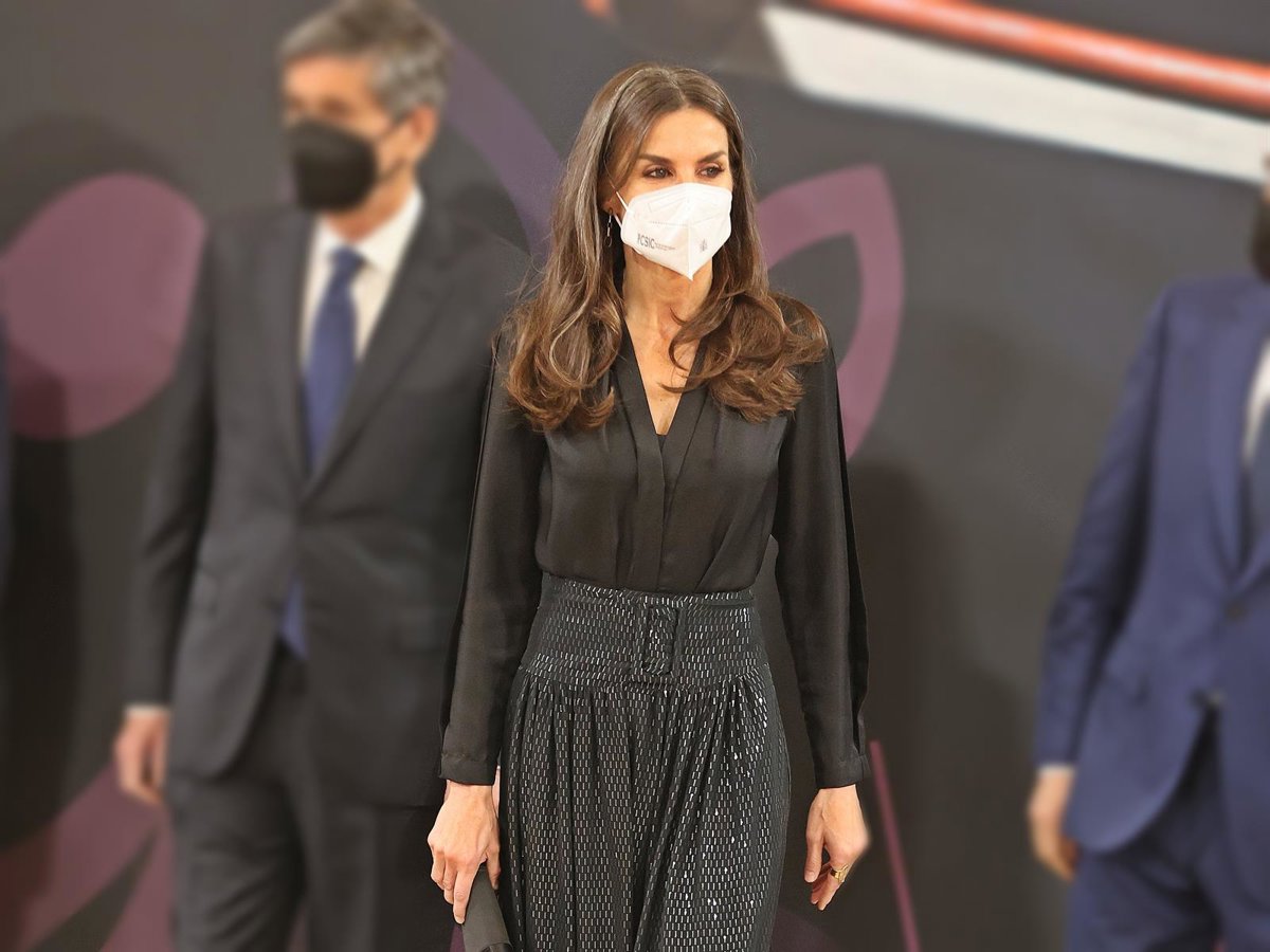 Volviendo al estilismo de la Reina Letizia, la falda midi de color negro, con vuelo y bordada con pequeños cristales de Purificación García de la que tanto se va a hablar corresponde a Doña Sofía, por lo que la reina ha vuelto a recurrir al armario de la emérita para lucir -y de paso hacerle un guiño-.
