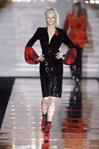Para el día, trajes de chaqueta entallados en tweed y espiga, faldas a la rodilla, jerseys cashmere y vestidos en tweed de Gales y gabardinas. Para la noche, vestidos espectaculares con largos hasta el suelo en lentejuelas o de seda con bordados de flores así como vestidos de cóctel acabados en mangas de seda bordada estampado manila. Los rojos, negros y