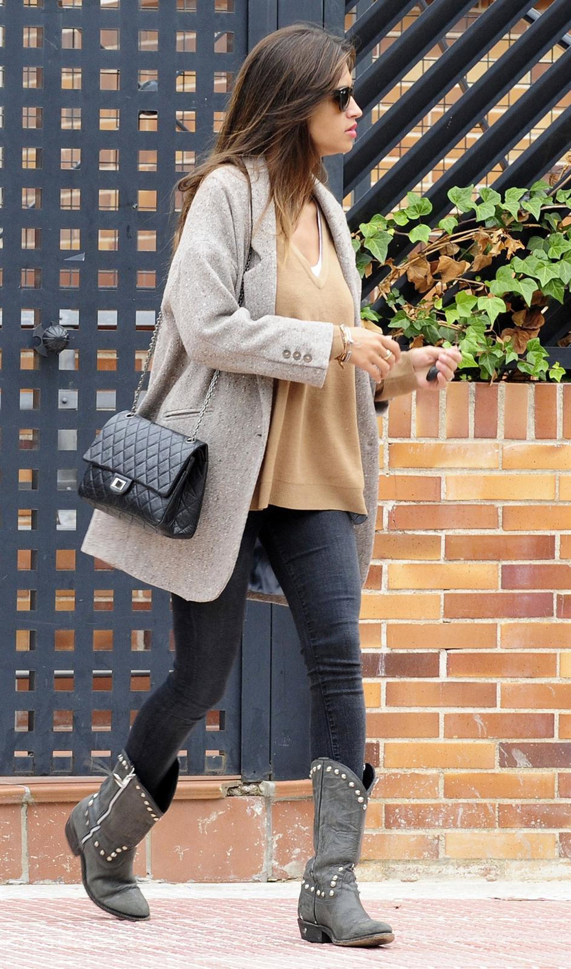 Y esta ocasión no iba a ser menos, porque la hemos vuelto a 'cazar' saliendo de su domicilio vistiendo unos jeggins negros, un jersey de punto en tono camel y de cuello pico, un abrigo estilo blazer oversize, unas botas cowboy y el clásico bolso en versión guateada con solapa de Chanel.