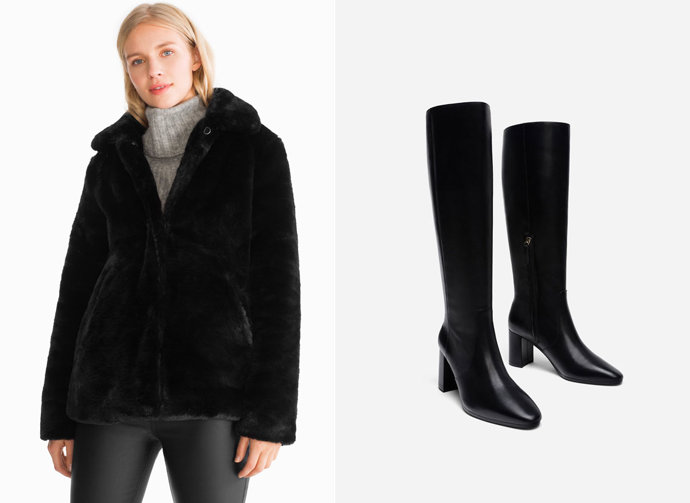 Para protegerse del frío de Madrid, Sara apostó por una chaqueta de borreguito como la que puedes encontrar en C&A por 69 euros; y para sus pies lució unas botas altas negras como las que tienen en Uterqüe (159 euros).
