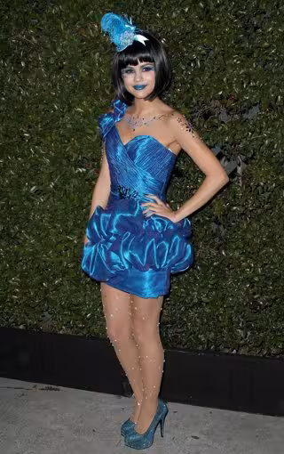 De esta guisa acudió Selena Gomez al cumpleaños del conocido bloguero Perez Hilton, quien organizó una fiesta por todo lo alto en Hollywood con el azul metálico como tema principal. Con minivestido abullonado en la falda, un gracioso tocado compuesto por un pequeño sombrero de copa y una pluma y un maquillaje de lo más excéntrico, la joven artista lució espectacular.