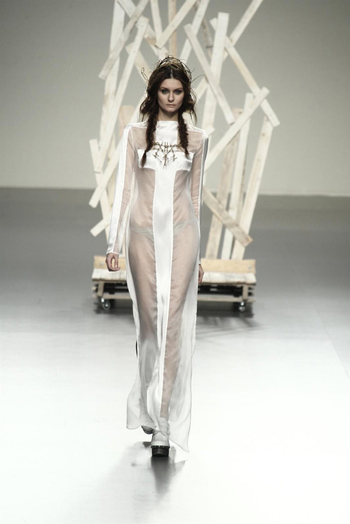 El mikado se ha unido a atuendos que emulaban sacos para aportar rigidez a los diseños, aunque también ha habido espacio para la fluidez que ha venido de la mano de la gasa y de los primeros diseños que se han presentado. Unos vestidos-túnica en tonos crema que dotaban de la máxima pureza a las prendas.