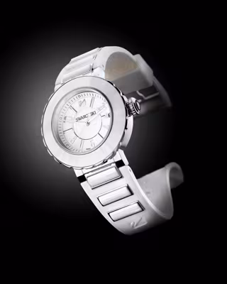 Swarovski tiene más de 115 años de experiencia en cristal facetado y ha hecho pleno uso de este exclusivo know-how al trabajar con cerámica por primera vez. La empresa ha logrado una auténtica proeza técnica, impartiendo un brillo excepcional equivalente al del cristal a este reloj facetado de cerámica blanca.