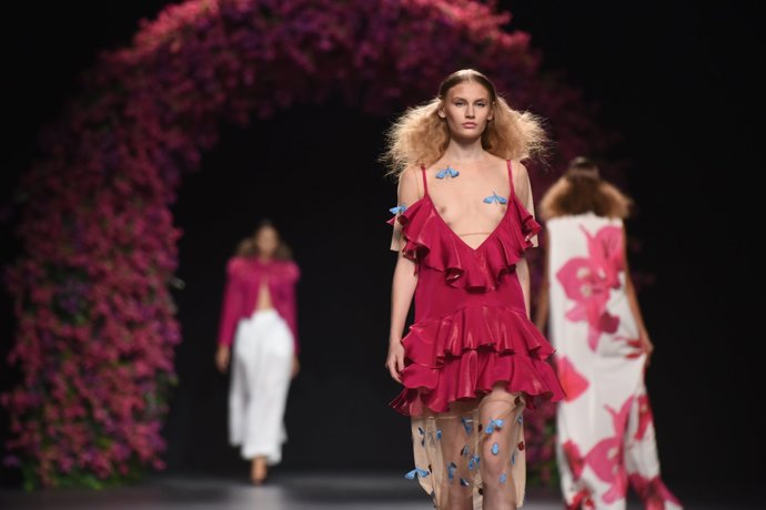 La música de Juana Martín. Ecléctica, por la combinación de tendencias, es el título de la colección de la diseñadora cordobesa, sin embargo, Juana Martín no ha podido obviar a su tierra con la buganvilla, la flor de Córdoba, que ha estado presente en el arco de la pasarela pero también en el color de sus prendas, y en la música de un violín, un cajón, una guitarra y unas palmas que han puesto la banda sonora a un desfile que acabó mientras sonaba ‘A mi manera’.