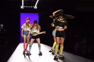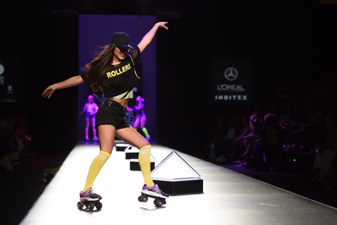 El cierre de Maya Hansen. Cuando Maya era niña, patinaba y de esa afición y de su amor por California ha surgido Rollers, la colección inspirada en los skaters, hockey patines e incluso las botas que la finalista del Premio Nacional de Moda de 2014 recrea en sus corsés y tops, pero uno de los momentos más emocionantes del espectáculo -porque Maya también hace espectáculo- lo protagonizó la patinadora internacional Marta García, que cerró el desfile sobre ruedas con un corsé negro con mucho brillo y detalles en amarillo.