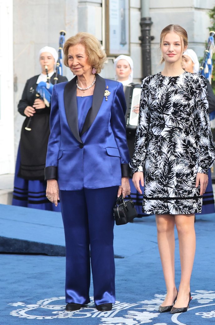 Aunque no ha sido el mismo diseño, las dos han optado por un dos piezas de pantalón y chaqueta en color azul. Doña Sofía marcaba la diferencia al lucir tejido satinado y color negro en las solapas y puños de la chaqueta. Ambas muy elegantes, se trata de un diseño que realza sus figuras y que estiliza por su color.