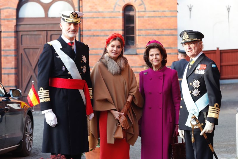 En noviembre de 2021, los Reyes viajaban hasta Suecia y en su primer encuentro con los Reyes de Suecia en las Caballerizas Reales, la monarca se superó a sí misma con un look tan estiloso como royal. Dando protagonismo a los complementos, se dejó ver con un tocado -estilo turbante- color naranja con delicadas flores en la parte frontal; un vestido midi de corte recto en color anaranjado; y una sofisticada capa con cuello de pelo sintético en color camel.