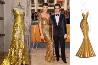 Este espectacular vestido de noche es creación del diseñador Zac Posen. El atuendo esta formado por diez mil lentejuelas, bordadas a mano sobre una exquisita tela. Las lentejuelas, de cinco tamaños diferentes están hechas sobre una lámina de oro de 24 quilates. Esta maravilla está valorada, ni más ni menos, que en 1,5 millones de dólares. Posen se ha inspirado en el vestido que lució la modelo Crystal Renn en la Metropolitan Opera House de Nueva York en septiembre de 2011, donde se representaba Ana Bolena y como podemos comprobar, la similitud entre ambos diseños es evidente.