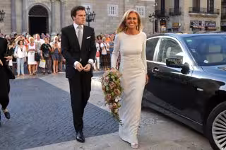 Rosa Clara sorprendió muy gratamente a todos los invitados a su boda con un espectacular vestido de novia muy sencillo pero elegante y apropiado. Muy alejado de lo que podíamos imaginar, vestía espectacular un vestido recto, sin cola, de manga larga y escote cerrado con detalles en la cintura de lentejuelas color blanco brillante con forma parecida a las alas de una mariposa.