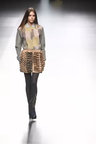 Importantes han sido los detalles de trabajadas espigas en relieve que recorrían mangas, faldas, pantalones y camisas con pliegues de cintas de goma. Y es que la diseñadora de Martin Lamothe se ha dejado llevar por una línea muy estricta y militar con cortes de pratonaje y diagonales para crear movimiento en la pañería, pero en cuanto a la organza, vestidos rectos y columna con líneas muy cortas y muy largas.