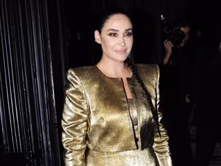 Si el año pasado nos sorprendía con un vestido fucsia, esta vez ha apostado por un conjunto de tres piezas doradas: falda de corte midi tubo, crop top y una chaqueta torera con cuello redondo y hombreras. Un look rompedor con el que se convertía en el centro de todas las miradas.