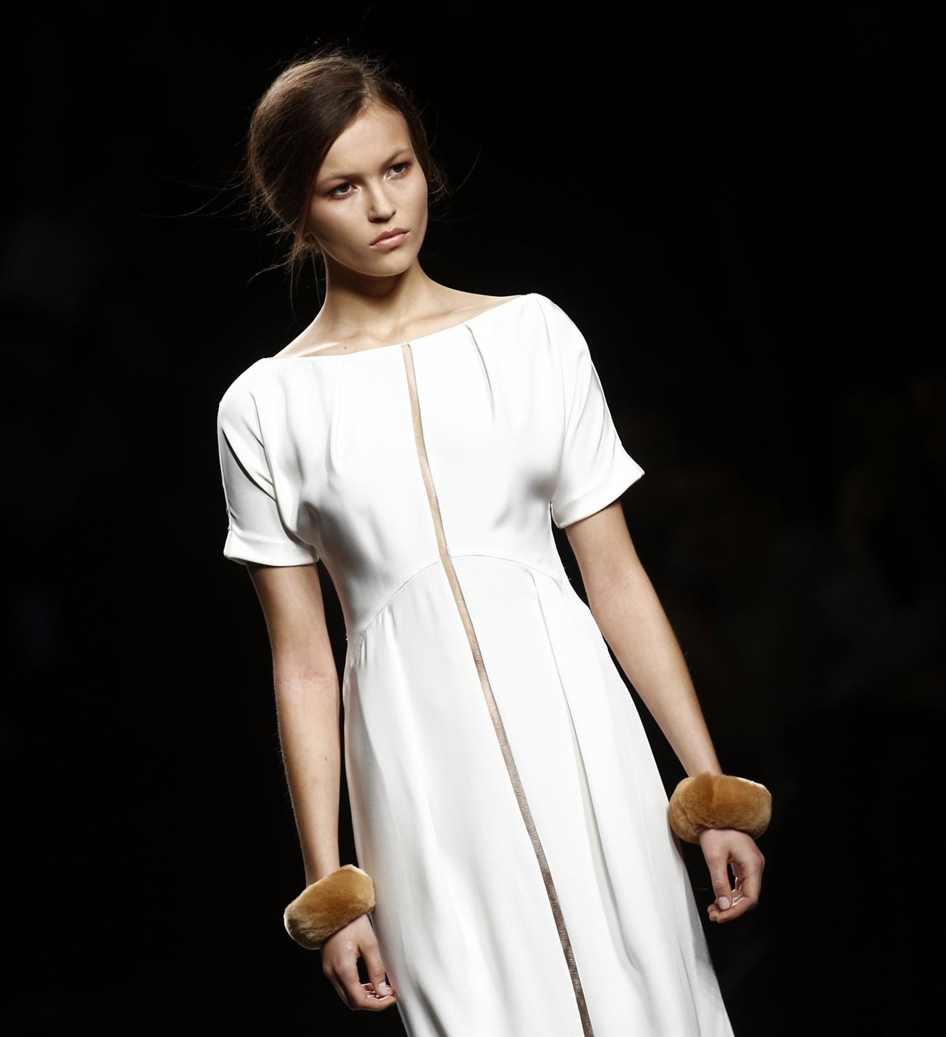 Cinturas pronunciadas con cinturones en ocre, bolsos y estolas de piel de zorro como complemento. La paleta cromática comprende verde, beige, granate, morado, salmón, negro, gris y blanco como color protagonista.